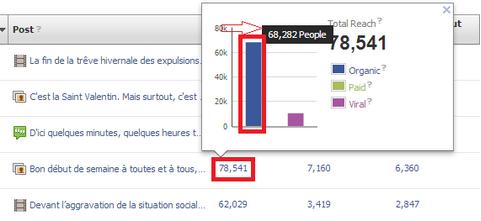 Số liệu organic reach rất dễ tìm thấy trong Facebook Insights. Trong Insights, bạn click vào con số đằng trong cột Reach sau mỗi bài post và đưa chuột vào cột màu xanh sẽ thấy được con số reach cụ thể là bao nhiêu.