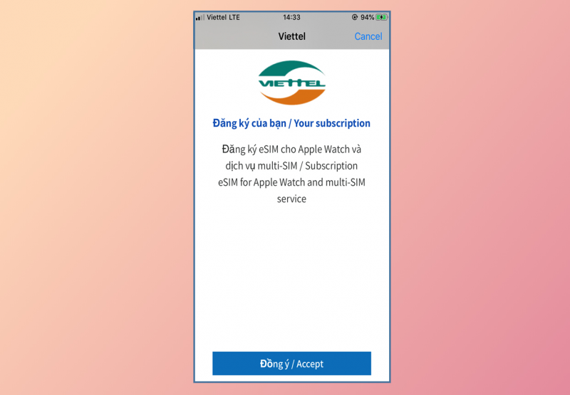 Bước 4: Tại giao diện đăng ký, bạn nhấn chọn đồng ý để đăng ký sử dụng dịch vụ eSIM Viettel trên Apple Watch.