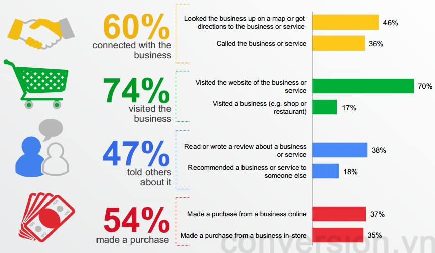 Nếu đến lúc này mà bạn vẫn còn nghĩ rằng đa số người dùng sử dụng điện thoại di động chủ yếu để nghe, gọi, chụp ảnh hay check-in Facebook thì có lẽ bạn nên suy nghĩ lại. Cùng với sự phát triển nhanh như vũ bão về cả tính năng và thị phần của các smartphone và tablet thì năm 2014 được dự báo sẽ là năm bùng nổ của các thiết bị di động này tại Việt Nam. Dựa theo báo cáo “Our Mobile Planet” của Google thì hiện nay có khoảng 97% người dùng tìm kiếm các thông tin trên điện thoại di động của mình và 54% trong số đó từng thực hiện giao dịch mua hàng trên điện thoại của mình.