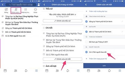 Tiếp đến hãy mở ứng dụng Facebook > Truy cập vào trang cá nhân >Tùy chọn chỉnh sửa trang cá nhân > Chính sửa chi tiết > Người theo dõi.