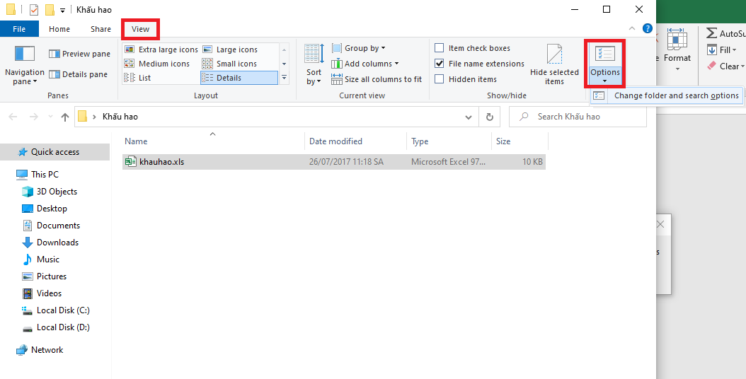 Bước 2: Tiếp theo, các bạn chọn thẻ View trên thanh công cụ. Sau đó các bạn chọn Options tại mục Show/hide. Thanh cuộn hiện ra các bạn chọn Change folder and search options.