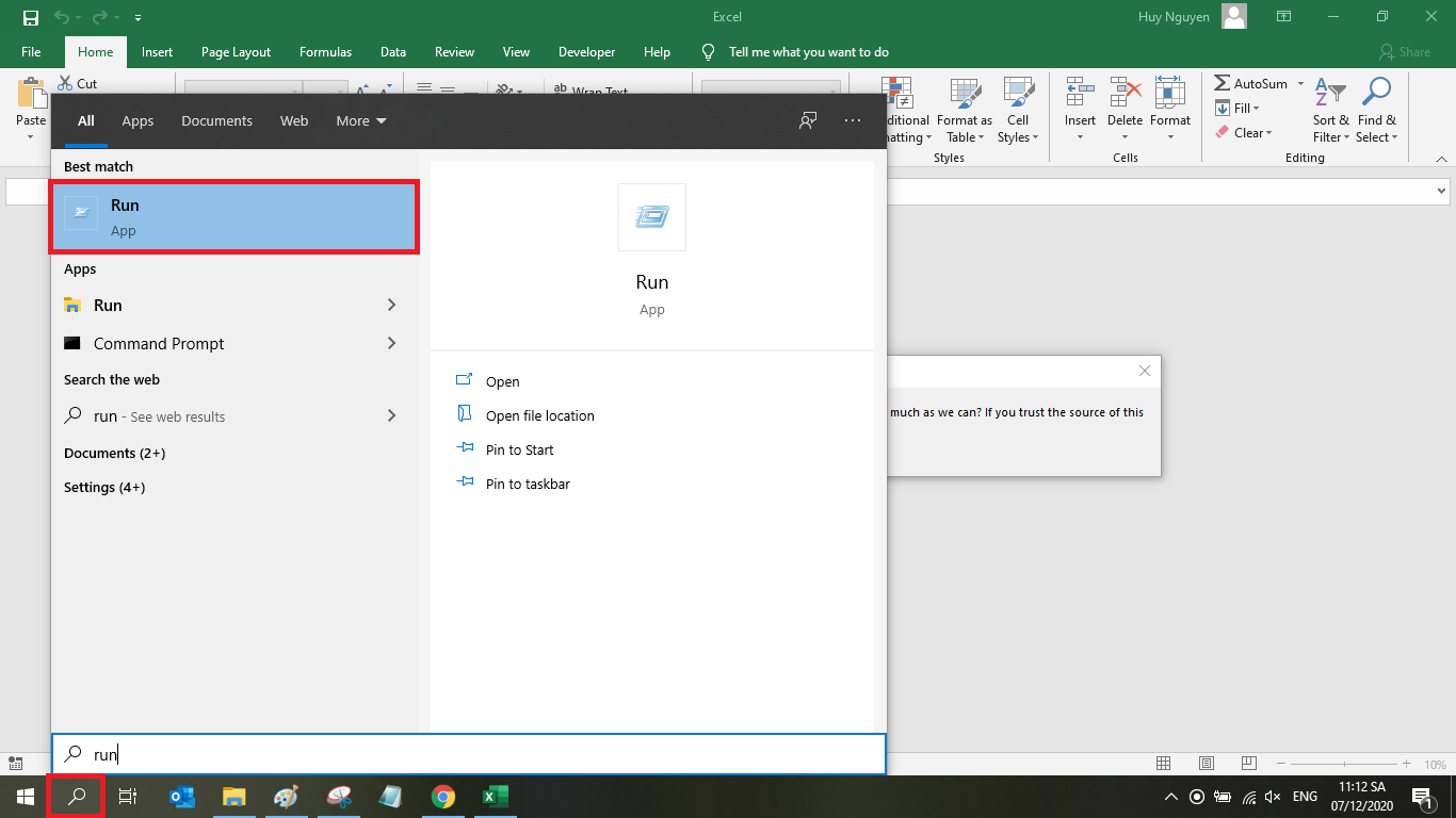 Hoặc các bạn có thể nhấn vào mục Search của window rồi nhập Run vào. Kết quả hiển thị thì các bạn chọn mục Run. Hoặc các bạn cũng có thể sử dụng tổ hợp phím tắt Window + R để mở hộp thoại Run.