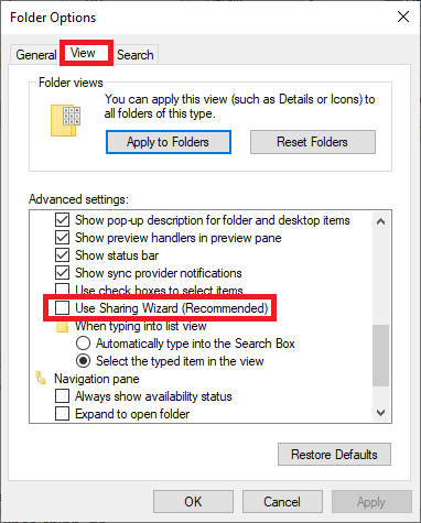 Bước 3: Lúc này, hộp thoại Folder Options hiện ra. Các bạn chọn thẻ View. Sau đó tại mục Advanced settings các bạn kéo xuống tới ô Use Sharing Wizard (Recommended) thì bỏ dấu tích chọn tại ô này đi. Cuối cùng nhấn Apply => OK. Chỉ cần như vậy là từ giờ các bạn đã có thể truy cập bình thường vào các file Excel có đuôi .xls mà không bị bắt phải lưu file dưới một cái tên khác.