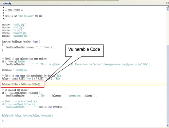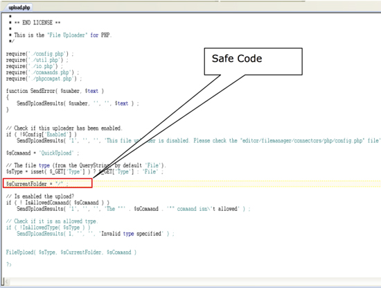 Ngoài ra, các quản trị viên website cũng có thể khắc phục thủ công bằng cách thay đổi trực tiếp mã nguồn trong tệp tin upload.php. Thay đổi ‘sCurrentFolder = GetCurrentFolder()’ thành ‘sCurrentFolder = “/”’.